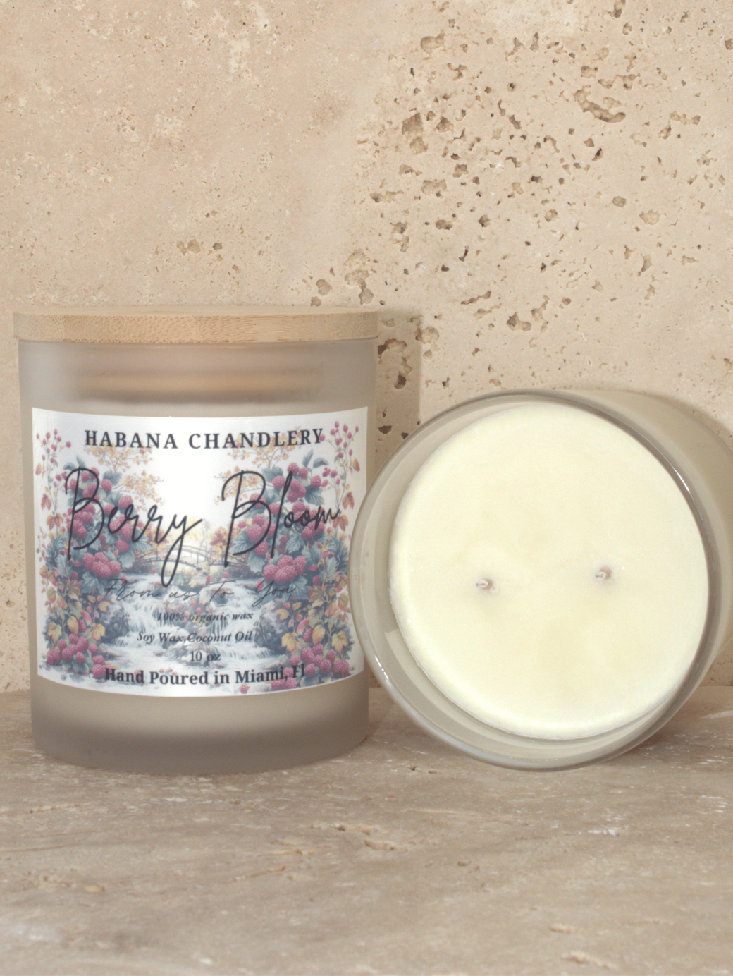 Handcrafted soy blend candle with phthalate-free fragrance oils, essential oils, and two cotton wicks.